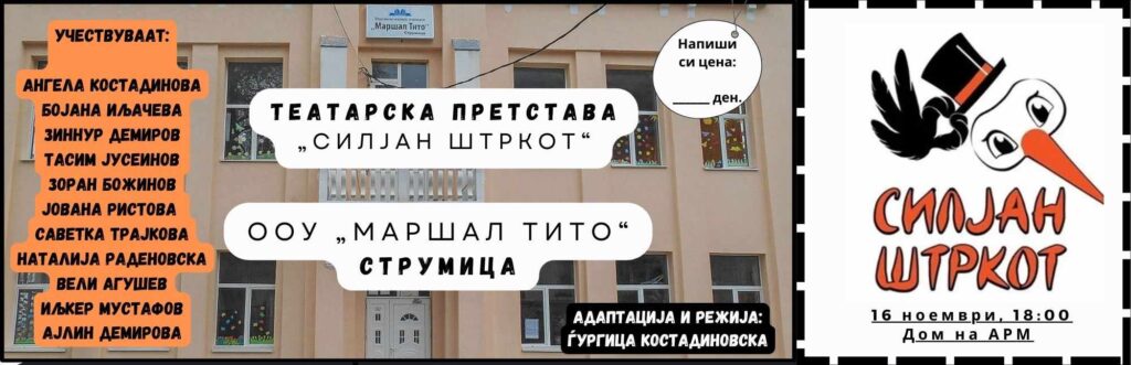 На тема „Силјан Штркот“, со сценарио и режија на професорката Ѓургица Костадиновска, учениците ќе изведат театарска претстава на сцената во Дом на АРМ, Струмица. Учениците од I до V одделение, под менторство на професорката Љубинка Цветанова ќе настапат со песната „За сите деца“. А пред самиот крај, публиката ќе има можност да чуе оркестар со сплет песни изведени од учениците кои ќе настапат под менторство на професорот Ване Кољушков.